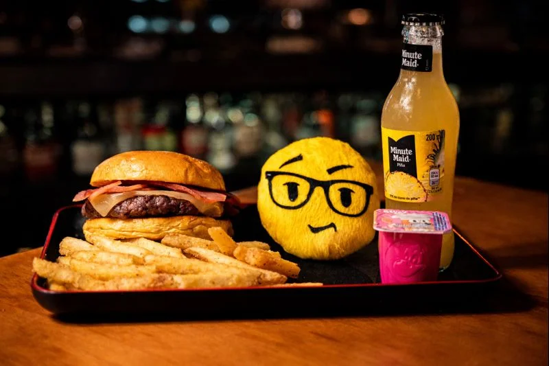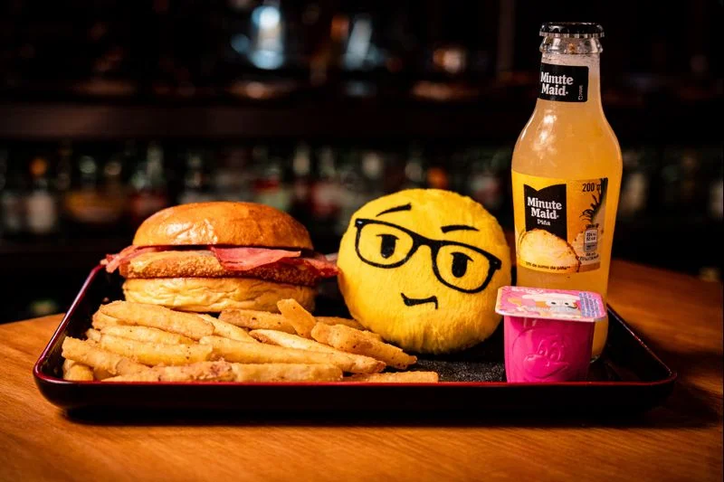 Menú de burger de pollo con queso, acompañado de patatas fritas, bebida, postre y juguete infantil.