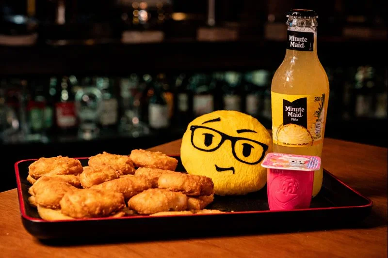 Menú de nuggets de pollo, patatas fritas, bebida, postre y juguete infantil.